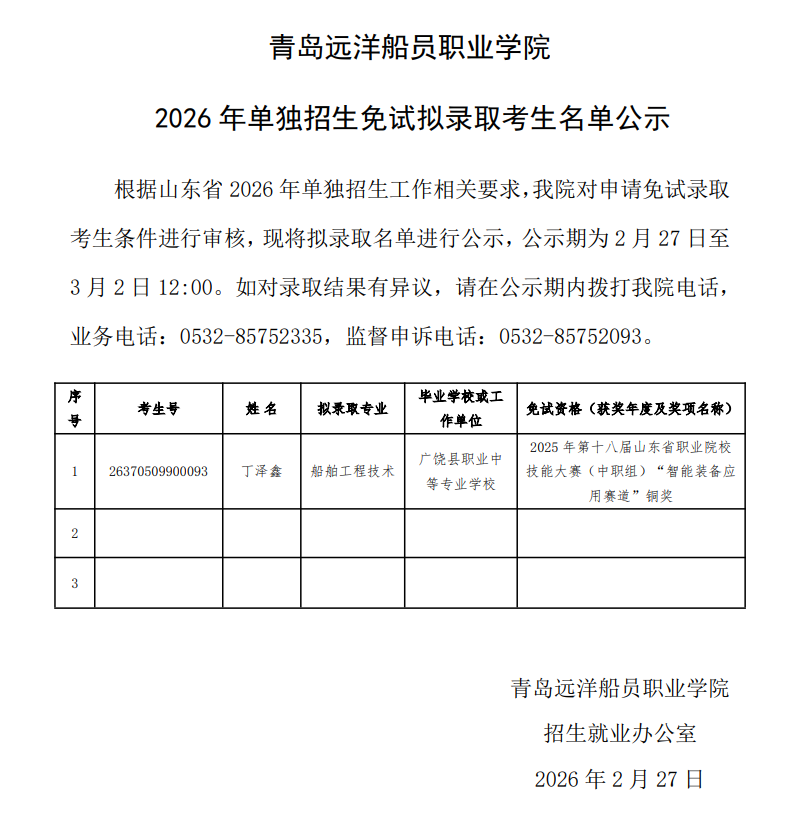 青岛远洋船员职业学院2026年单独招生免试拟录取考生名单公示